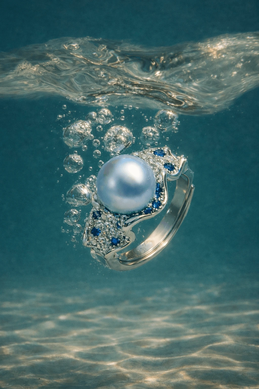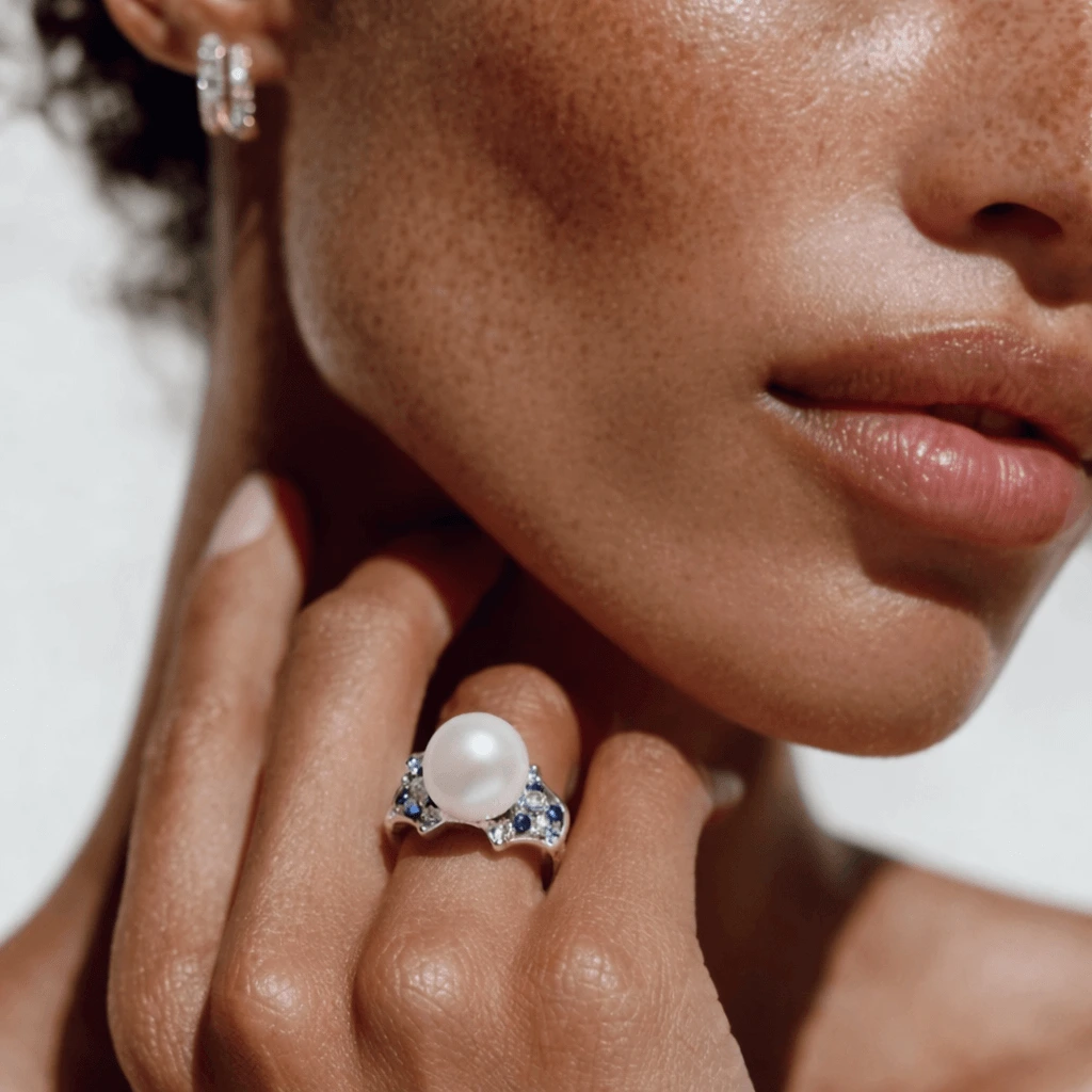 Inspired by sunlight dancing on ocean waves, the Ocean Breeze Pearl Ring features a luminous pearl and flowing silhouette. A modern statement piece, adjustable for comfort, bringing the romance and freedom of the sea to your hand.